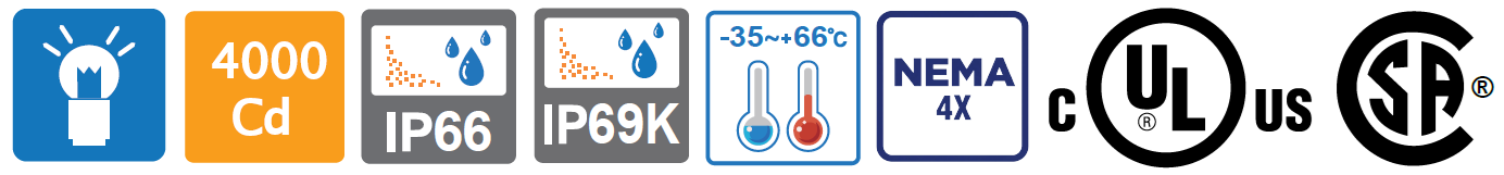 Grado de protección: Nema 4X, IP66, IP69K para servicio continuo exterior o interior.