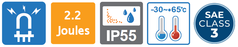 Grado de protección: SAE J1318 Clase 3 (equivalente a IP55) Servicio continuo exterior o interior.