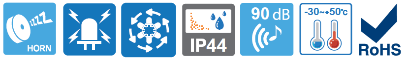 La SERIE EQ100 viene con luces de señalización de tamaño estándar de Ø100 mm con una apariencia atractiva, luz de baliza giratoria simulada, intermitente y estroboscópica.
