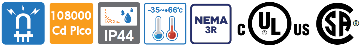 Las perforaciones en los dispositivos audibles 50GC y 350 (se venden por separado) facilitan la instalación. Las unidades pueden conectarse de forma independiente o simultánea con el dispositivo audible. La Visalert utiliza un tubo estroboscópico lineal y todo el circuito está integrado en la lente.