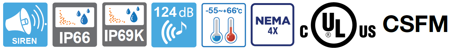 En primer lugar, la Sirena SelecTone® SERIE 302GCX de 124dB y 30W cuenta con 259.1 mm de Ancho, 353.1 mm de altura y 254.0 mm de profundidad. Está disponible en 24 VAC/DC, 120 o 240 VAC para 50/60 Hz y ha sido diseñado para Zonas Peligrosas. Asimismo, el altavoz amplificador SelecTone® modelo 302GCX está diseñado para producir tonos, mensajes de voz digitales y megafonía en directo en entornos adversos.
