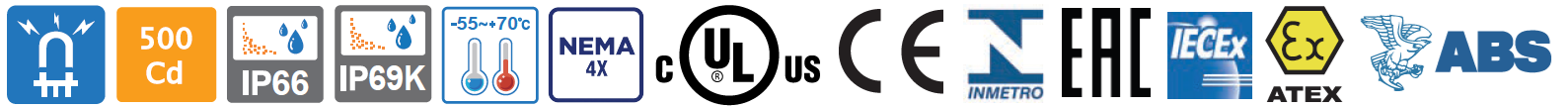 Cumple con la certificación Nema 4X, cULus, CE, INMETRO, EAC, IECEX, ATEX, ABS.