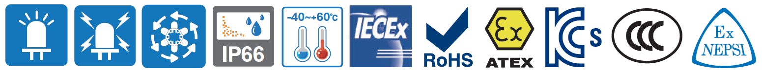 – Luz de señalización LED a prueba de explosiones, multifuncional y compacta, diseñada para su uso en entornos con gases explosivos con clasificación Ex d II C.