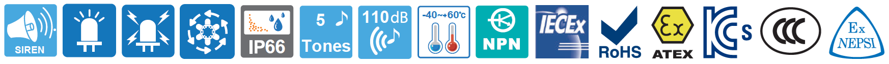 La Sirena con Circulina SERIES QNES es una combinación de baliza LED y sirena electrónica a prueba de explosiones de Ø92 mm con con práctica selección de funciones de luz fija/intermitente, estroboscópica y luz giratoria simulada.