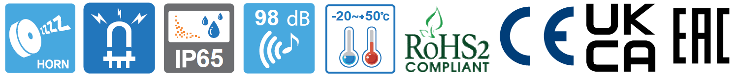 Volumen máximo: 98 dB a 1 m y Tono en una frecuencia de 110 Hz continuo permanente para contacto seco a distancia.