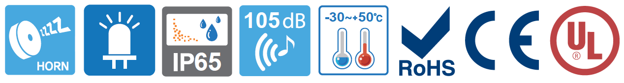 La Sirena con Baliza SERIES QAD125BZ es una Sirena que combina luz de señal LED fija/intermitente para montaje en pared de aproximadamente Ø125 mm de advertencia y bocina eléctrica permite la transmisión simultánea de señales visuales y audibles. con una salida de sonido de la sirena: máx. 105 dB.