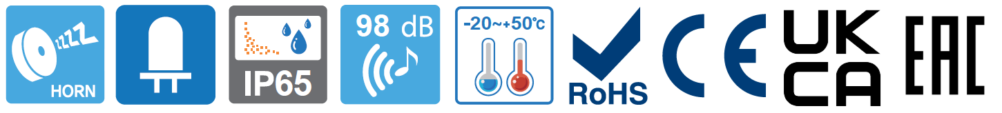 Volumen máximo: 98 dB a 1 m y Tono en una frecuencia de 110 Hz continuo permanente para contacto seco a distancia.